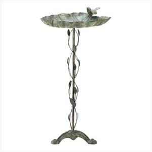 Balanced at the edge of a broad green leaf, a sparrow lifts his voice in a joyous springtime song. Distressed finish gives this handsome metalwork birdbath the appearance of a well-weathered antique. An enchanting garden decoration that serves as a welcome watering stop for thirsty birds! Cast iron and wrought iron. 14 3/4 inches x 12 1/4 inches x 27 1/2 inches high.