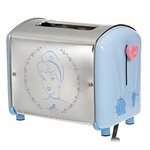 Specially designed to commemorate Disney's re-release of the Original Cinderella on DVD. Toasts Cinderella's slipper onto each slice. Plays a waltz when toast pops up. Extra wide slots, 5 setting browning control. Removable crumb tray. Classic stainless steel housing.